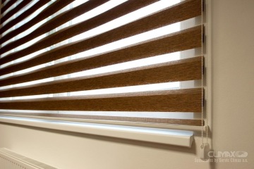 - Tento druh rolet je atypický svou kombinací dvou barev. Obsahuje průsvitné a neprůsvitné vodorovné pruhy, díky kterým lze snadno regulovat množství světla.